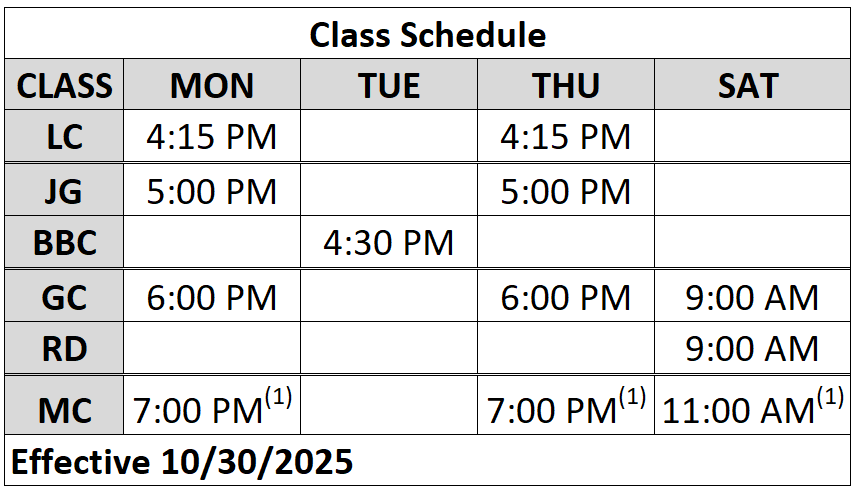 (1) Class time is 1.5 hours. 1 hour technique and optional 30 minutes positional sparring.